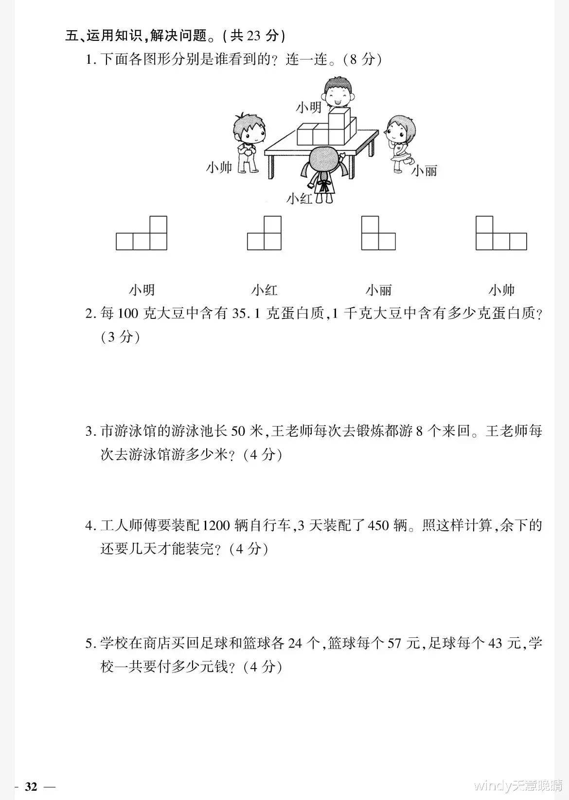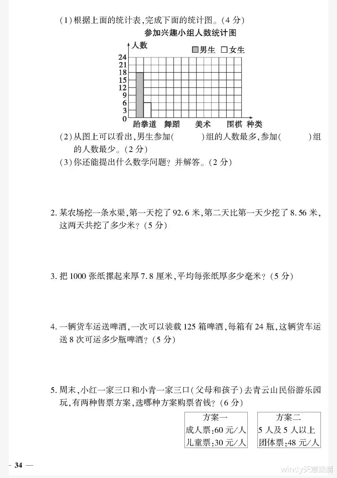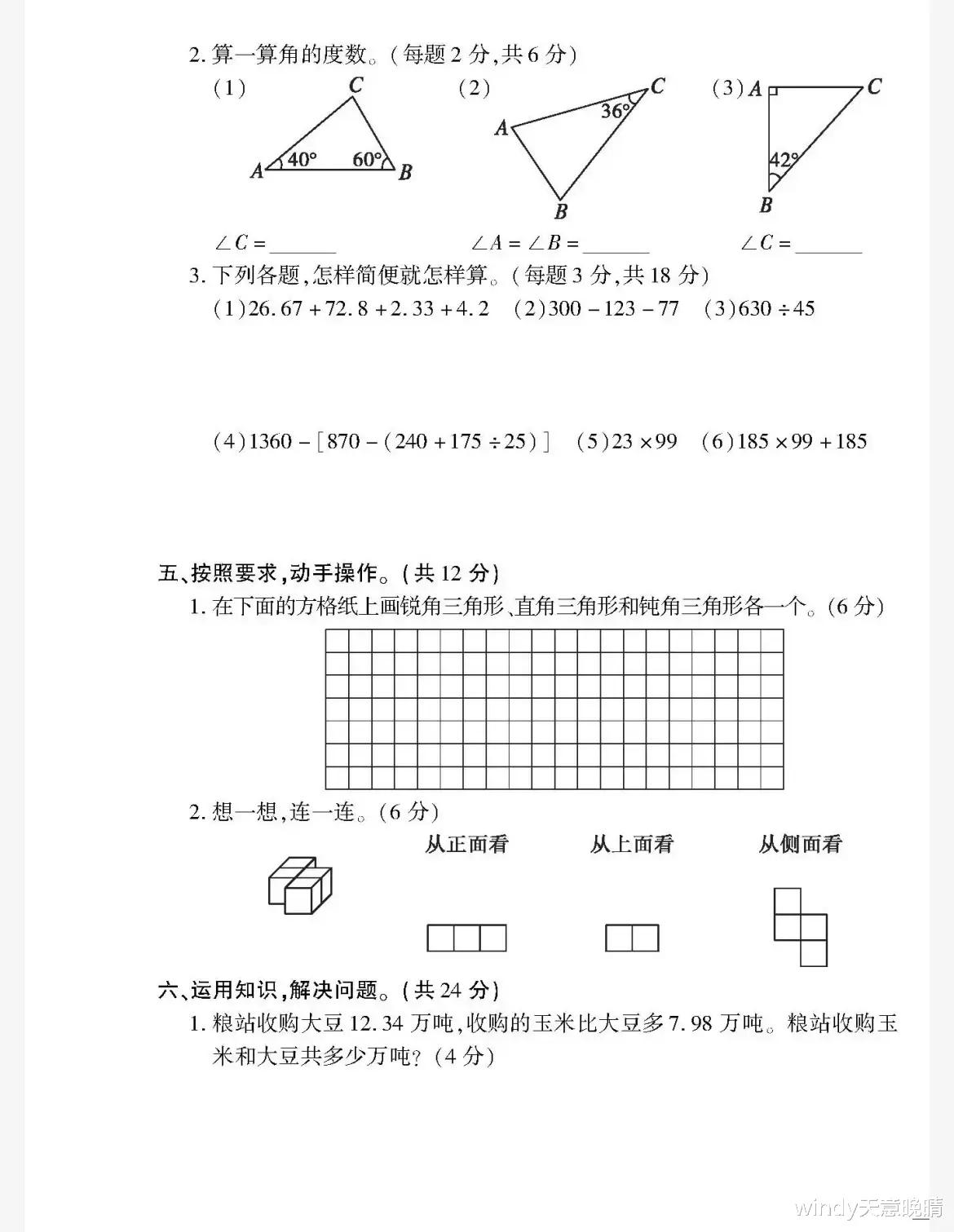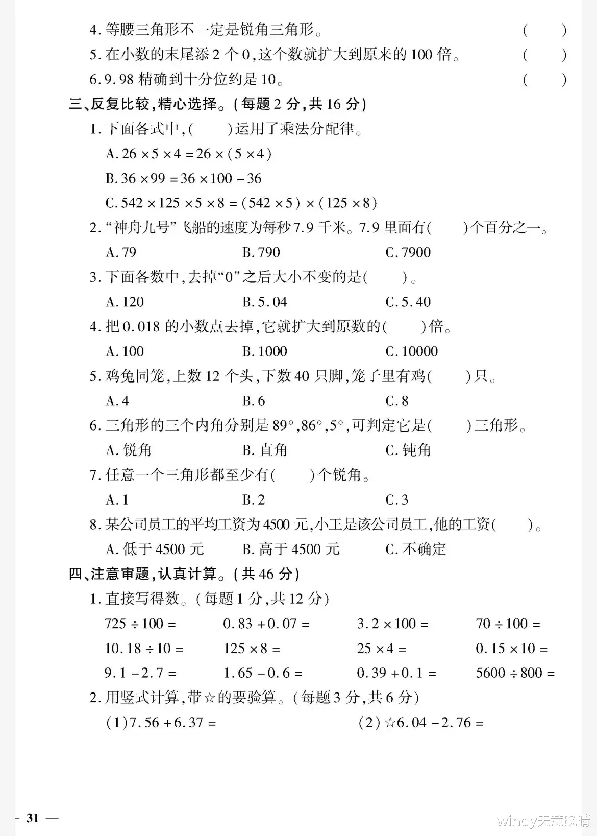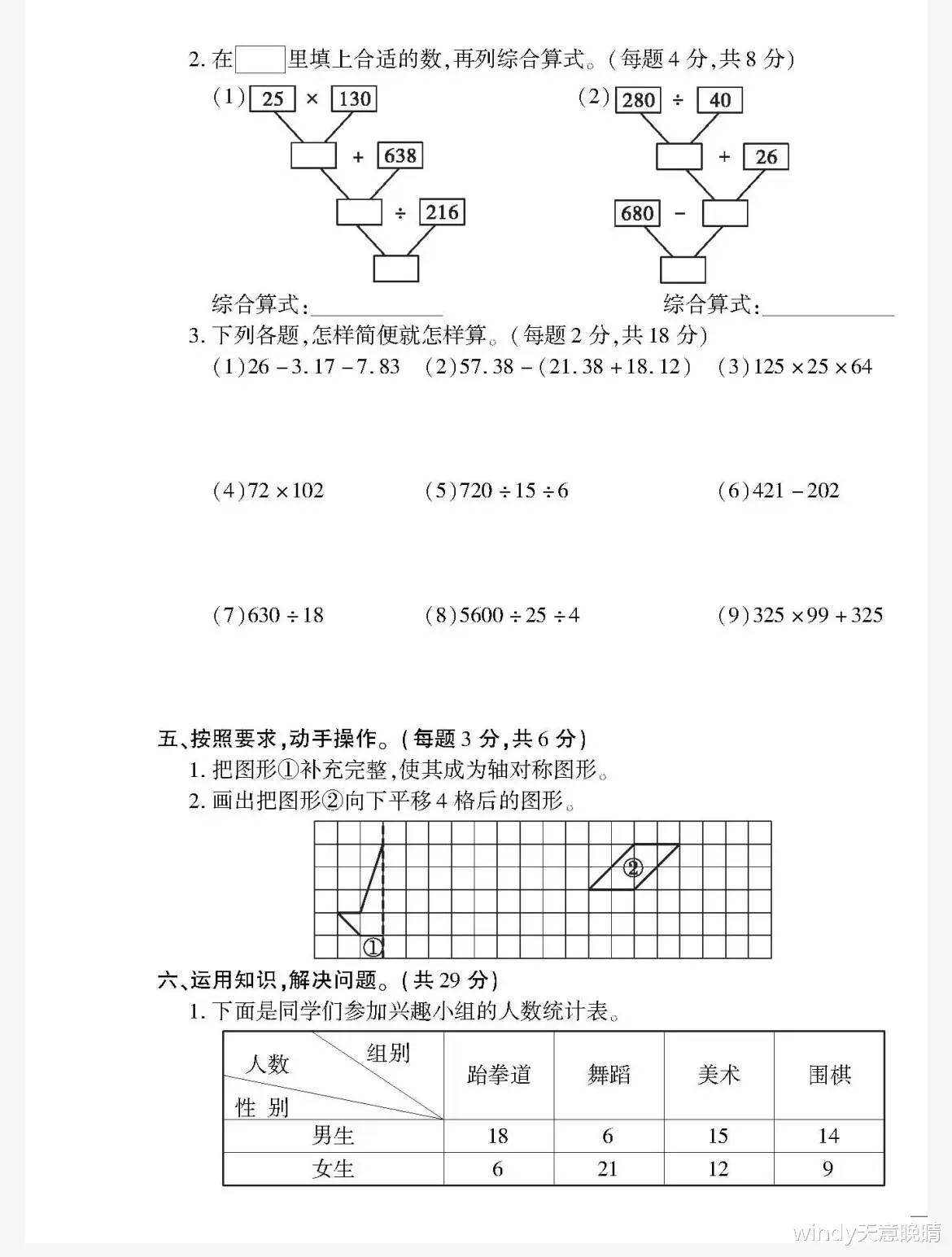 每日练习:3道四则混合运算+2道简便计算(如98×63=(100-2)×63)。