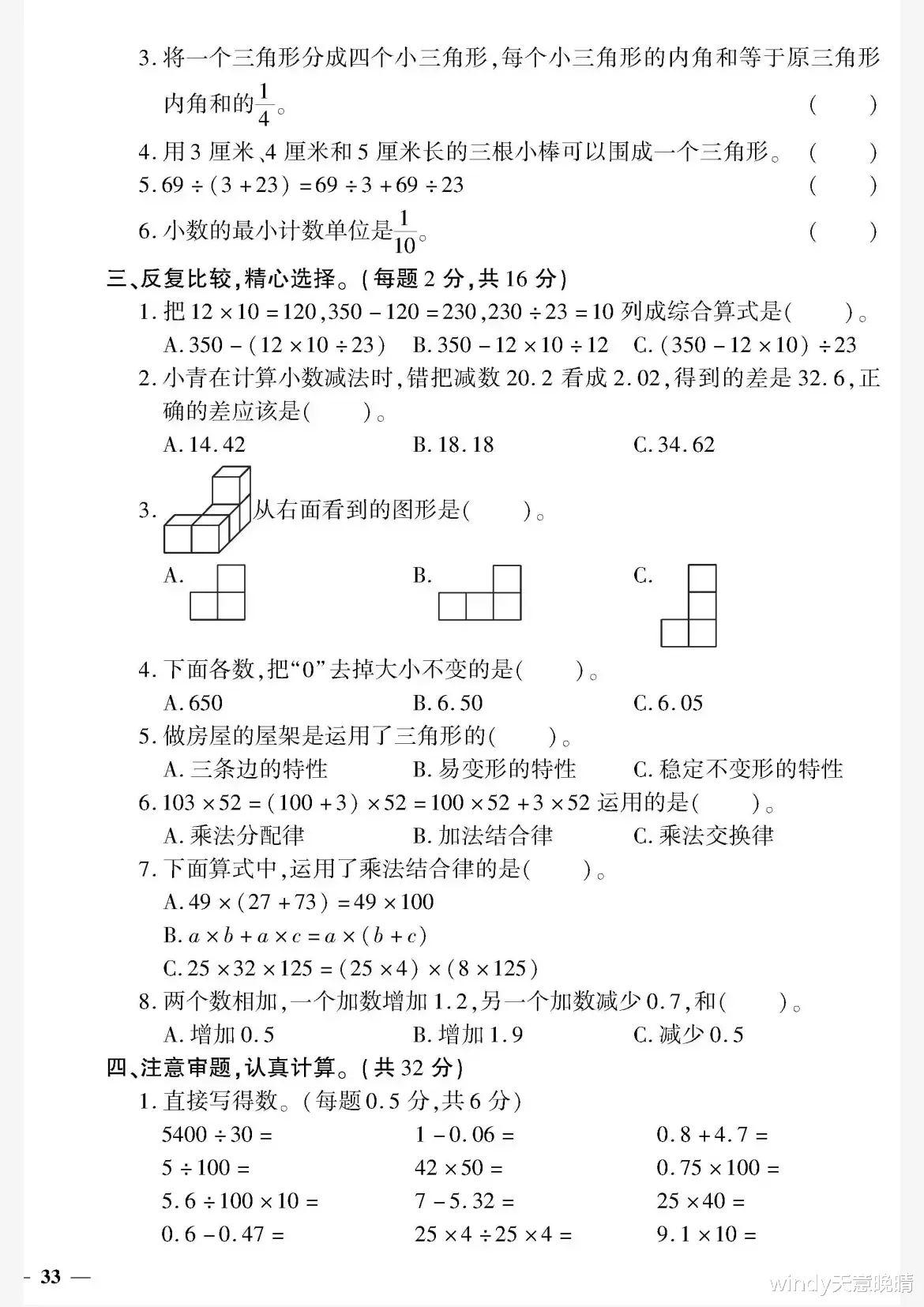运算定律:重点记忆交换律、结合律、分配律的公式和典型例题(如25×4、125×8等简算)。