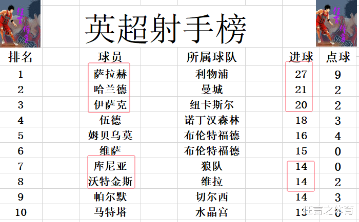 射手榜方面,萨拉赫还是没有进球,仍然是27球领跑,不过今天他送上了一次助攻,离20次助攻只差2次,30+20还是有望达成。伊萨克今天未能进球,还是差哈兰德1球,差萨拉赫7球排在第3。库尼亚破门,追上沃特金斯和帕尔默,三人14球并列第7。