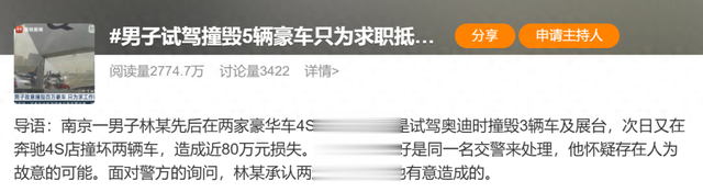据荔枝新闻4月18日报道,南京一男子林某先后在两家豪华车4S店试驾,先是试驾奥迪时撞毁3辆车及展台,次日又在奔驰4S店撞坏两辆车,造成近80万元损失。