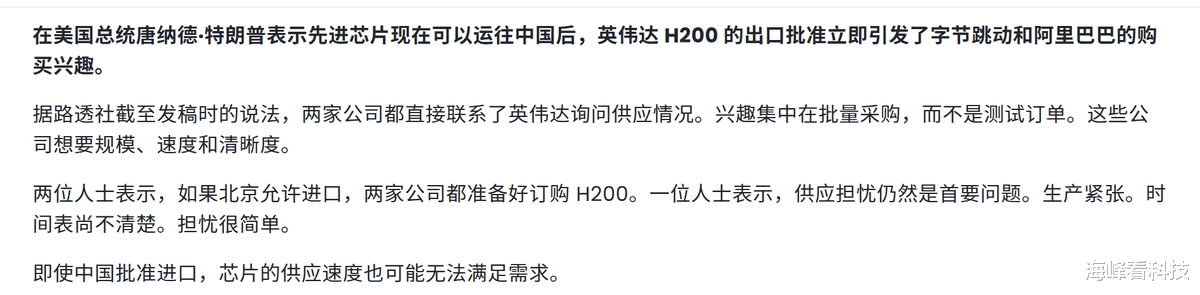 从市场反应来看,根据路透社报道,字节跳动和阿里巴巴这两家公司,早在上个月联系了英伟达询问供应情况,兴趣集中在批量采购,而不是测试订单。这些公司想要规模、速度和清晰度。此外,还有两位人士表示,如果北京允许进口,两家公司准备好订购H200。