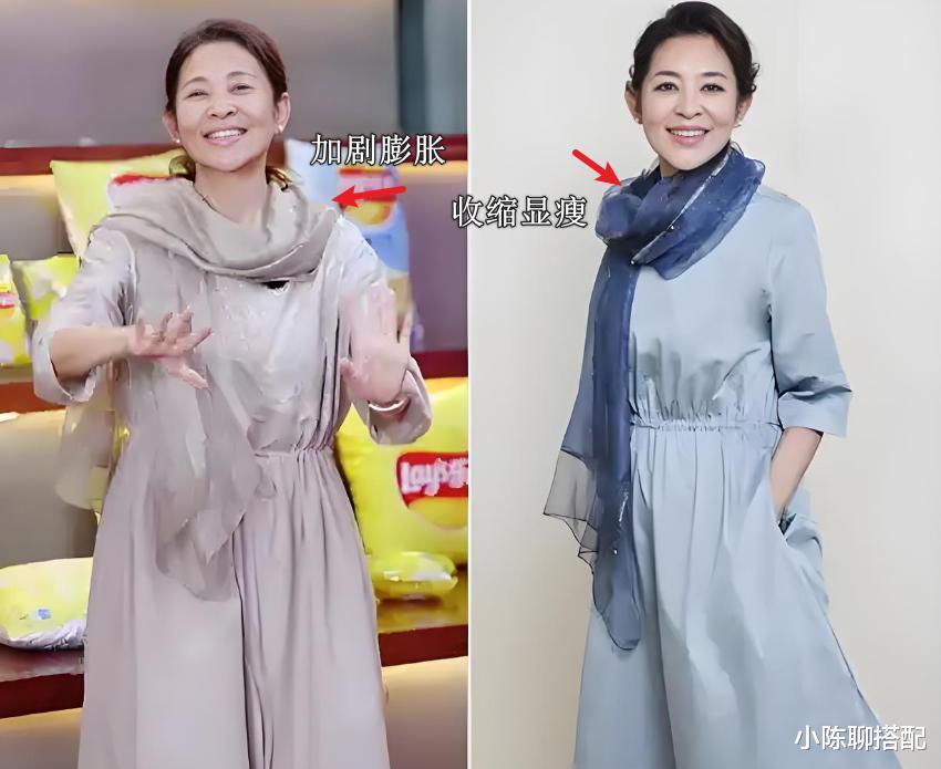 倪萍日常中很喜欢穿那种小圆领或者高领的衣服,还戴一条围脖,衬得人脖子短肩宽背厚。俗话说背薄一寸年轻十岁,背厚一寸必然也是老气10岁。