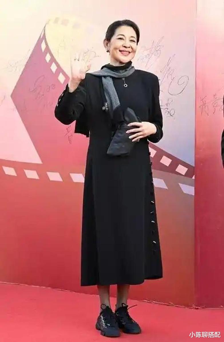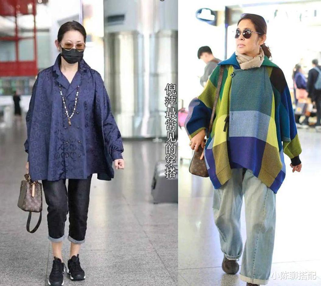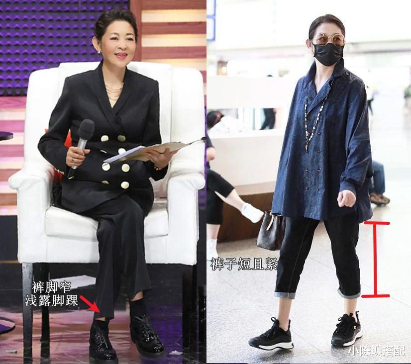 倪萍特别喜欢穿那种7/8分小脚裤或长裙,加上宽袍大袖的穿搭,就显得人很矮,头重脚轻。