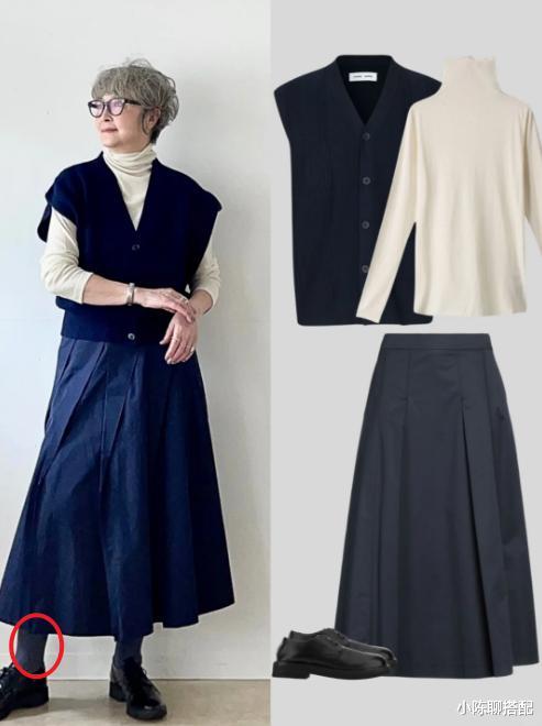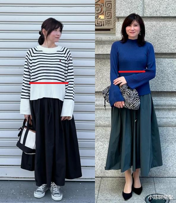 建议选择长度在脚踝上方10cm左右的裙子,露出脚踝,能够拉长腿部线条,显得更加纤细高挑。当然不是越短越好,中年人的体面是群不过膝。