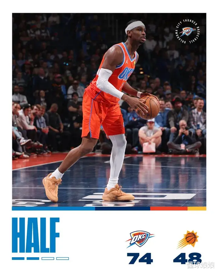 第二节雷霆单节拿到36分,半场打完领先26分,将太阳半场得分限制在48分。