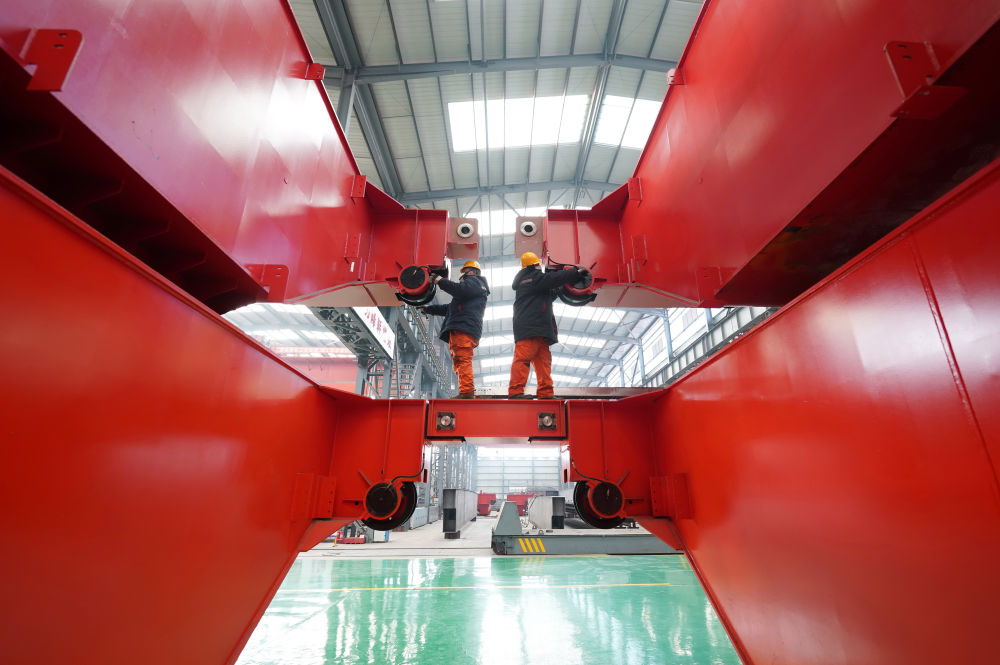 ↑2月14日,工人在唐山市丰润区一家起重设备制造企业的生产车间工作。