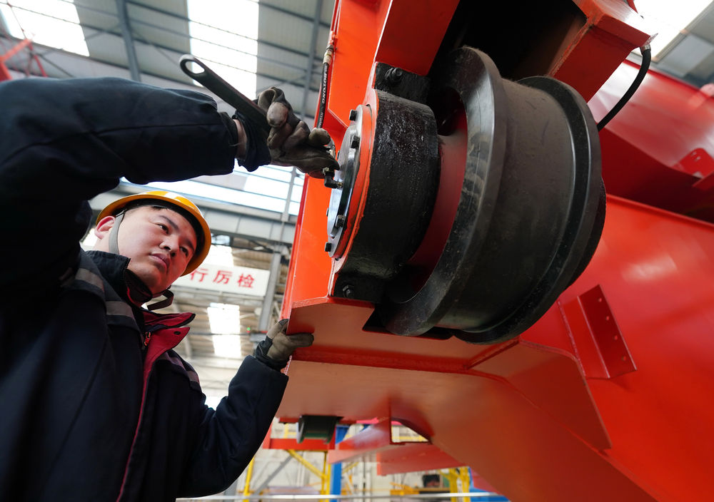 ↑2月14日,工人在唐山市丰润区一家起重设备制造企业的生产车间工作。新华社记者 杨世尧 摄