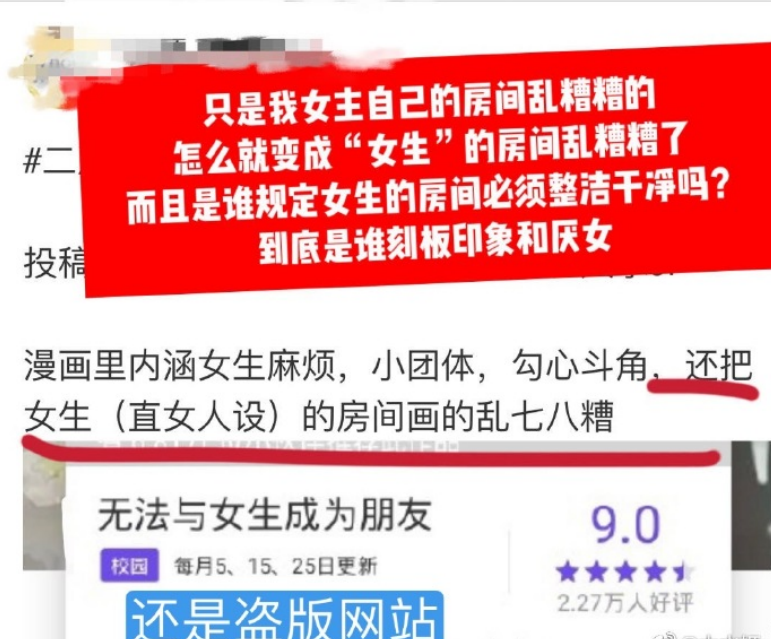 《无法与女生成为朋友》作者大水JI被断章取义贴上“厌女”标签,哪怕作品已连载80多集,充满亲情友情的温馨故事,仍挡不住盗版网站截图引发的性别对立攻击。惹得作者只能委屈怒吼:“你都没有看过我的漫画!我相信只要看过我漫画的人都知道这到底是一部怎样的漫画”。