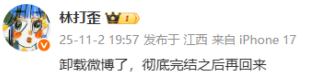 不堪其扰的林打歪最终卸载了微博,留下一句“彻底完结之后再回来”,并称此后不会再接商业漫画,便在社交平台销声匿迹。