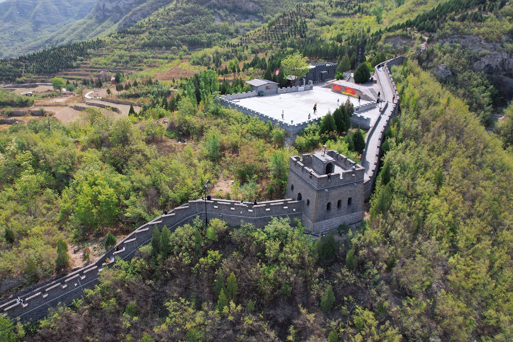 从高处俯瞰,明长城沿着山势蜿蜒曲折,四周草木茂盛,淹没掉高高的城墙,和平年代的长城,象征意义早已替代了实际功用。