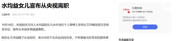 信息来源:红星新闻——水均益女儿宣布从央视离职