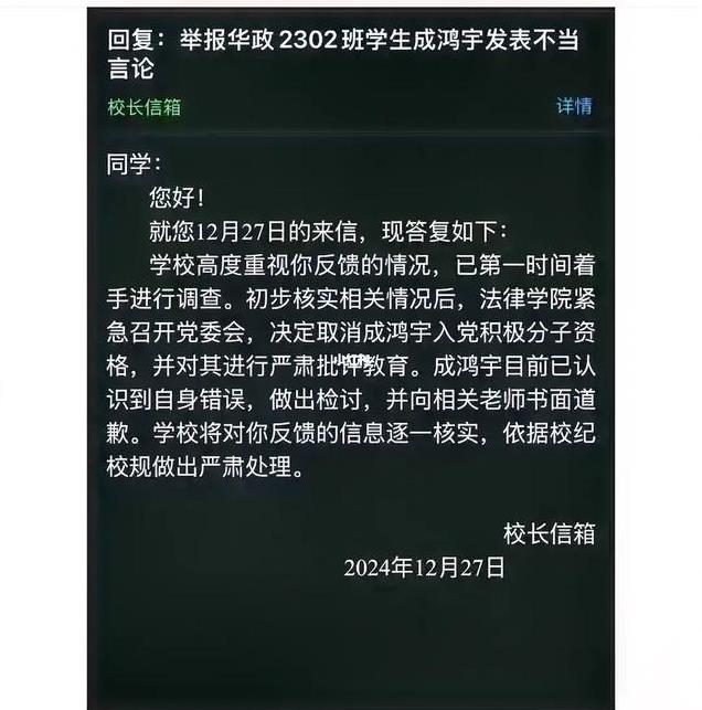 接下来登场的是成鸿宇同学,这位同学在期末报告里,发表了一些关于中国女性享有特权的看法,结果学校立马就取消了他的入党积极分子资格。这速度,比火箭还快!跟王梓璐事件一比,这反差也太大了点吧?不少网友都开始琢磨,学校这葫芦里到底卖的什么药?