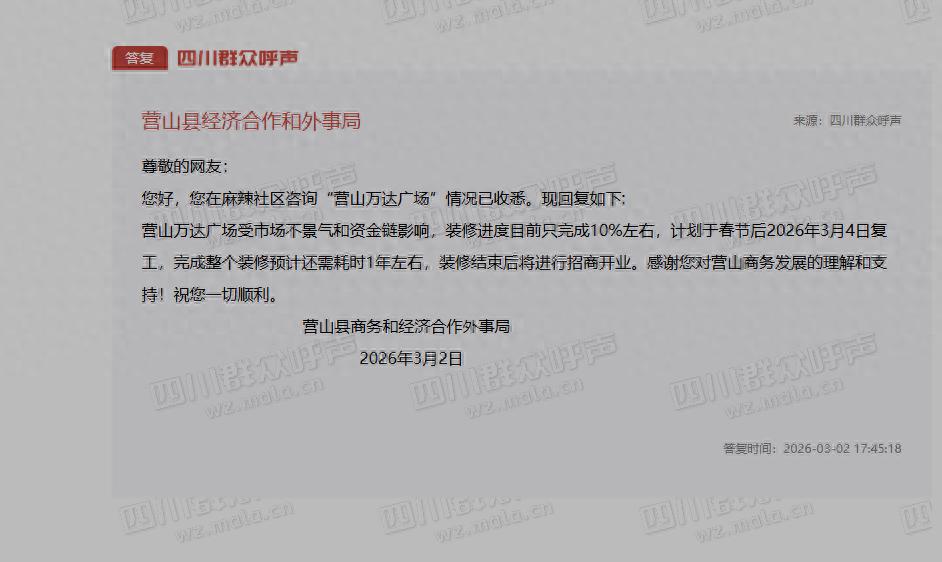 网友咨询,营山县万达广场何时才能招商开业?官方回复来了
