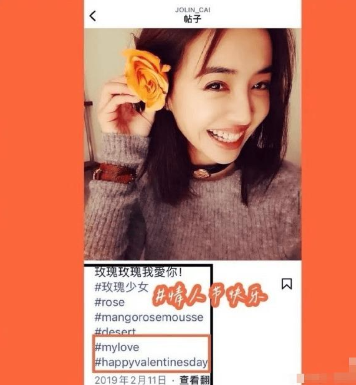 在 2019 年情人节,蔡依林晒出了一张戴着黄玫瑰的自拍,配文 “my love”,定位在日本一家需要熟人引荐的私人餐厅。