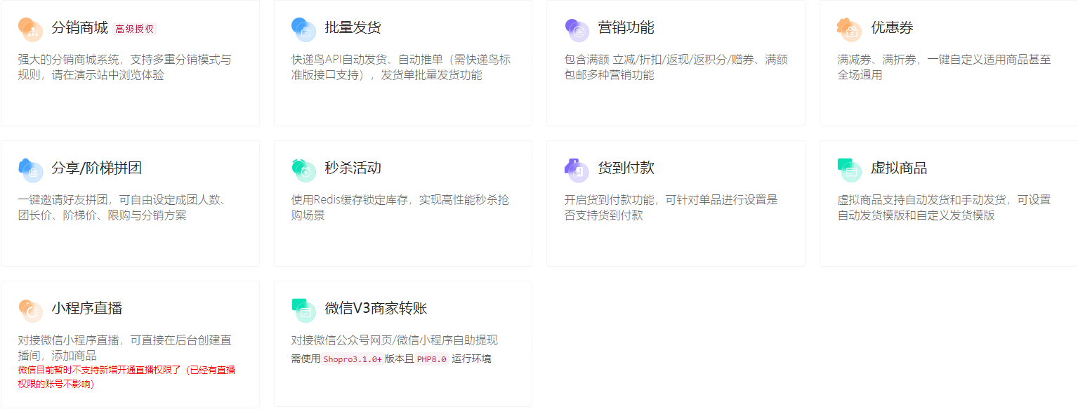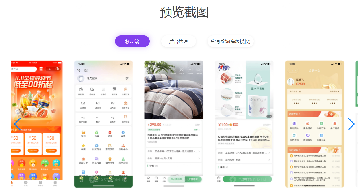 支持多平台(微信公众号、微信小程序、H5网页、Android-App、IOS-App)购物商城,拥有强大的店铺装修、自定义模板、路由同步、多端支付(微信,支付宝)、多规格商品、运费模板、多地区邮费、库存管理、全端分享等功能。