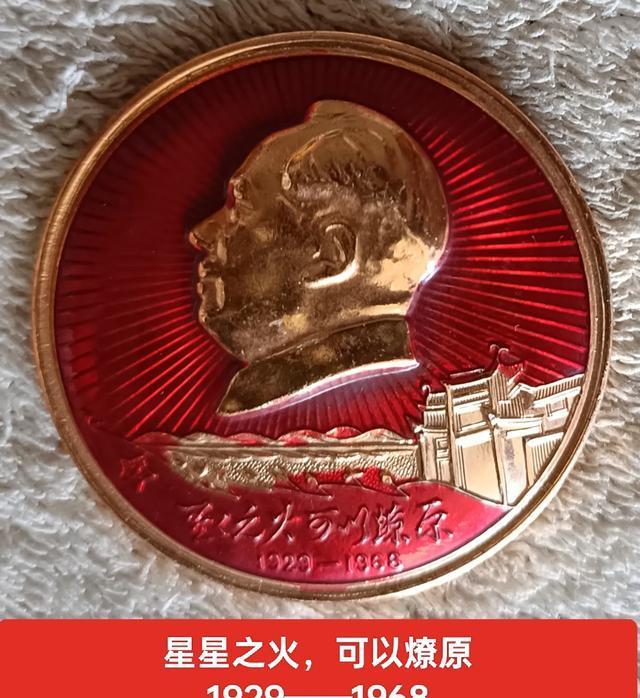 这是一件铭刻:为纪念毛泽东主席在于都召开万人大会39年之际而制作的纪念章。纪念章的形状为圆形,象征着毛主席如同我们心中的光芒四射的太阳。其中心位置是一枚毛主席左侧面部的浮雕,熠熠生辉,光芒万丈。浮雕下方雕刻着飘扬的红军旗帜,以及毛主席在江西于都的旧居场景,并附有毛主席的亲笔题词:“点点火星,足以燃起大火”。