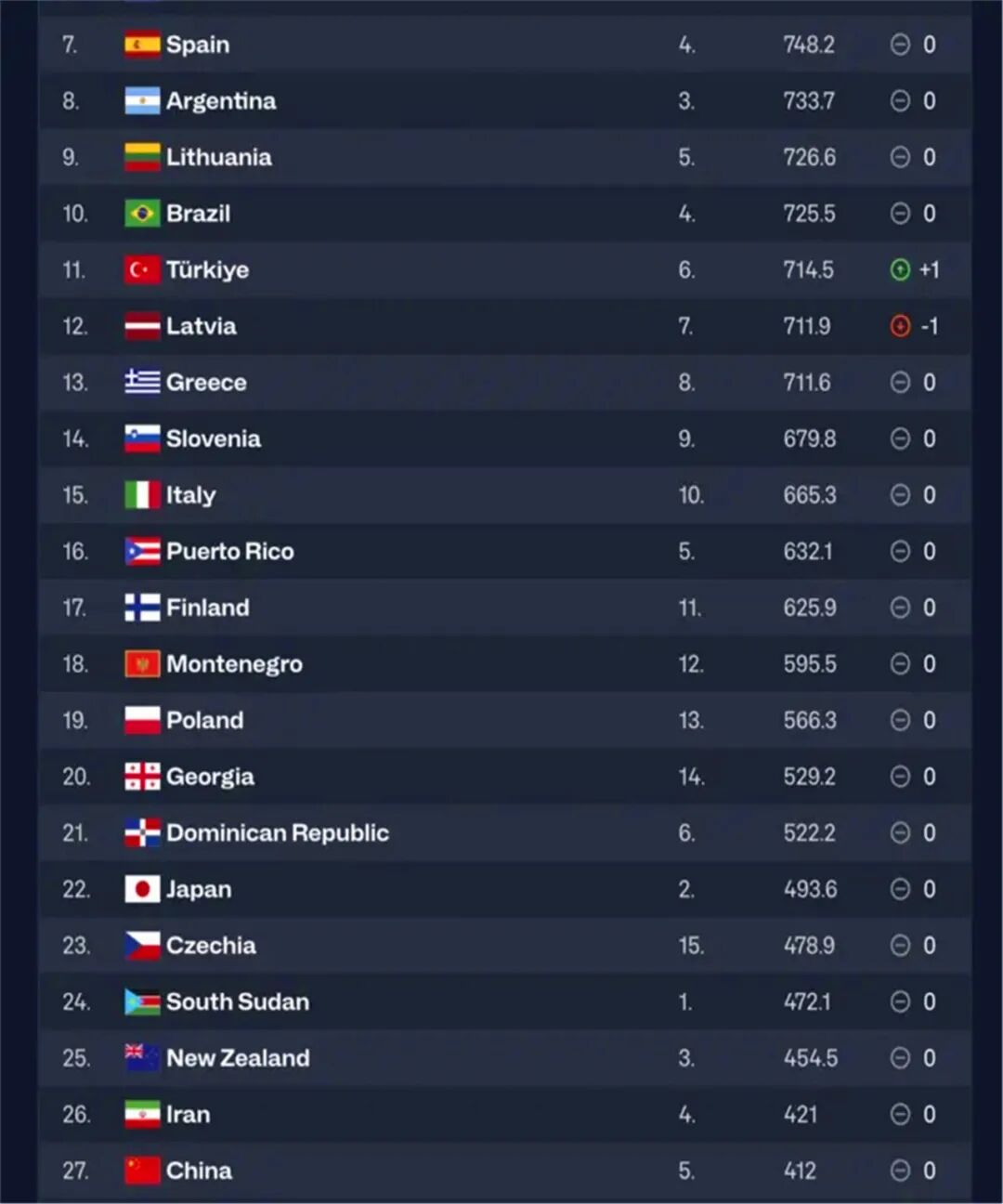 不过就在国际篮联刚公布完世界杯预选赛亚大赛区实力榜后,所有球队的最新世界排名也出炉了。北京时间的12月6日,国际篮联公布了最新一期的世界男篮排名,其中前十名的位置依旧没有任何变化,他们分别是美国男篮、德国男篮、塞尔维亚男篮、法国男篮、加拿大男篮、澳大利亚男篮、西班牙男篮、阿根廷男篮、立陶宛男篮和巴西男篮。