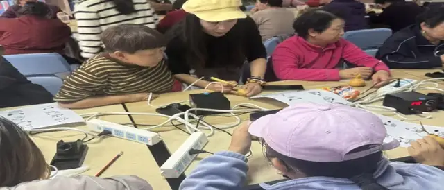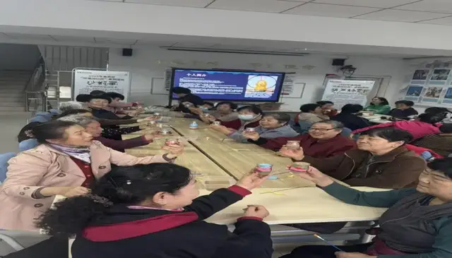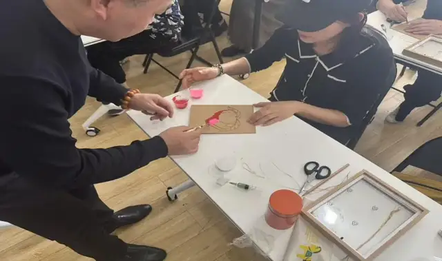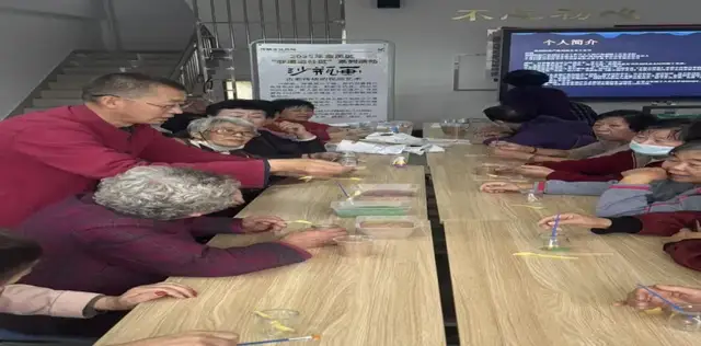 森林公园社区的金丝沙画体验区,宛如一片“流动的星空”。传承人王老师向居民展示着金丝沙画的制作过程:先用胶水勾勒出图案轮廓,再小心翼翼地铺上彩色细沙,最后用金丝镶边固定。在王老师的耐心分步演示下,居民们兴致勃勃地开始了自己的创作。不一会儿,一幅幅饱满圆润、色彩绚丽的“寿桃”便在居民们的巧手中逐渐呈现。金色的线条勾勒出桃子的丰腴形态,细密的彩沙则赋予了它鲜活的生命力。看着自己亲手完成的、独一无二的作品,每位居民的脸上都洋溢着满满的成就感与喜悦之情。本次金丝沙画体验活动,不仅让居民们零距离感受到了非遗艺术的魅力,锻炼了手脑协调能力,更在寓教于乐中增进了邻里感情,提升了社区居民的幸福感与归属感。