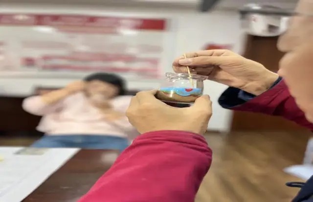 长城花园社区的沙瓶画体验区,传承人拿着细沙漏斗,向居民演示如何通过控制沙量和角度,在玻璃瓶中堆叠出层次分明的风景。“先铺一层蓝色做湖水,再用黄色堆出沙滩,最后用白色点缀浪花……”在老师的指导下,居民们发挥想象,有的创作“塞上湖城全景图”,有的制作“卡通动物乐园”。“第一次玩沙瓶画,感觉像在瓶子里造了一个小世界!”居民王宁小心翼翼地捧着完成的沙瓶,生怕惊动里面的“小风景”。沙瓶画以其独特的立体美感和创作自由度,成为社区里最受欢迎的项目之一,也让大家在细沙流转间体会到“慢创作”的乐趣。