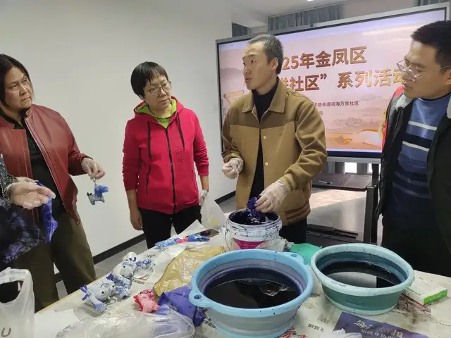 阅海社区的扎染活动现场,飘着淡淡的草木香——这里正在进行一场“环保+非遗”的创意实验。扎染非遗传承人马攀峰带领居民们用洋葱皮熬制的天然染料,为废旧T恤改造的白布上色。“折、扎、染、拆,每一步都充满惊喜!”居民们将白布折叠成各种形状,用皮筋扎紧后浸入染缸,拆开的瞬间,蓝白相间的花纹引得阵阵惊呼。大家在体验扎染乐趣的同时,也树立了“垃圾分类、变废为宝”的环保理念。