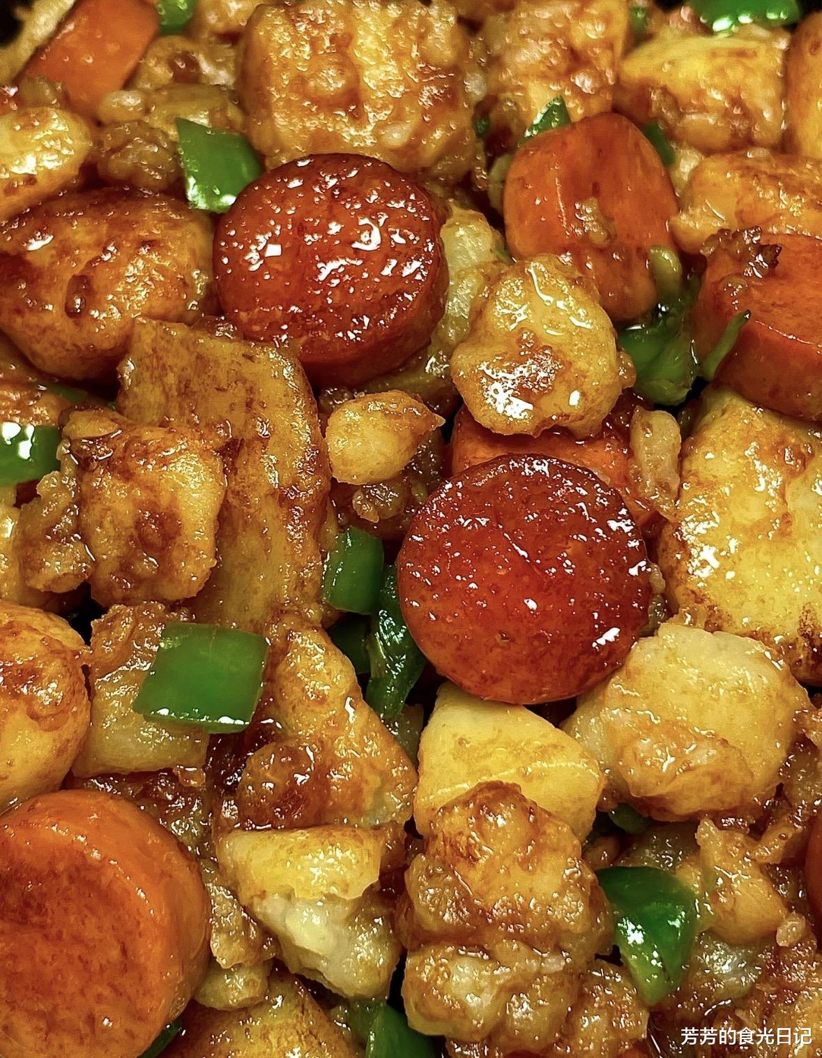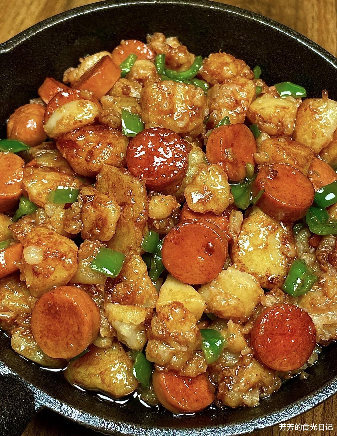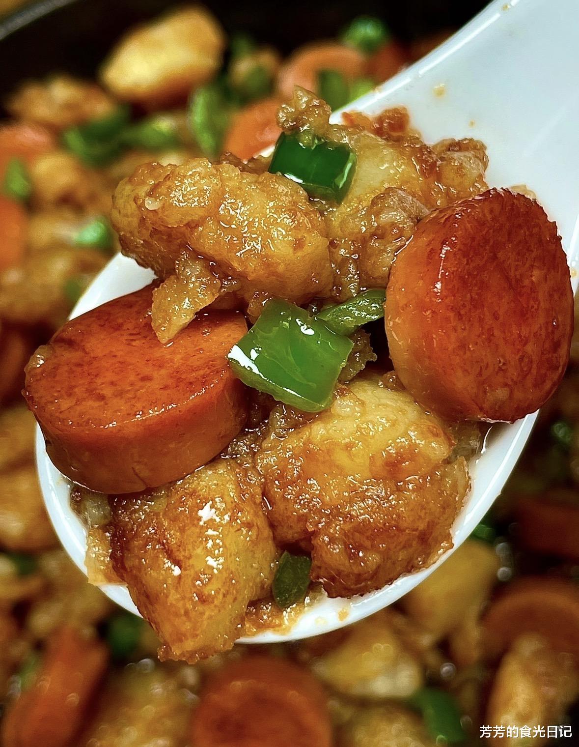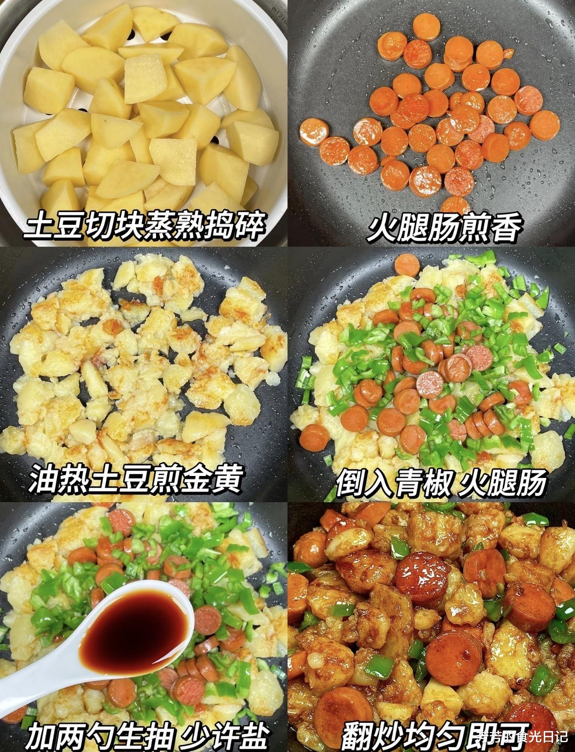 这道菜的神奇之处,在于它永远不需要精确到克的配方。土豆选表皮带土的黄心品种,切片时厚薄不必刻意均匀,泡水洗去淀粉后,用厨房纸吸干水分——这一步是防止粘锅的关键,也是让土豆外焦里糯的“秘密武器”。青椒不必去尽白筋,留一点辣味反而提神,切成滚刀块后,要等锅里的油温升到七分热再下。火腿肠用刀背拍松后斜切成厚片,这样煎的时候更容易逼出油脂,边缘微微卷起时,咸香能翻倍。