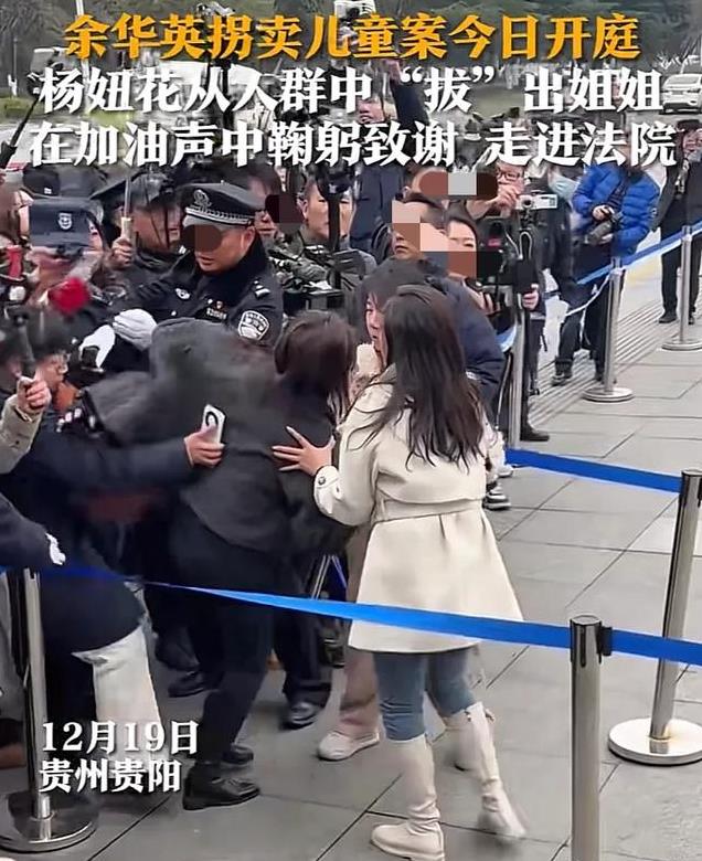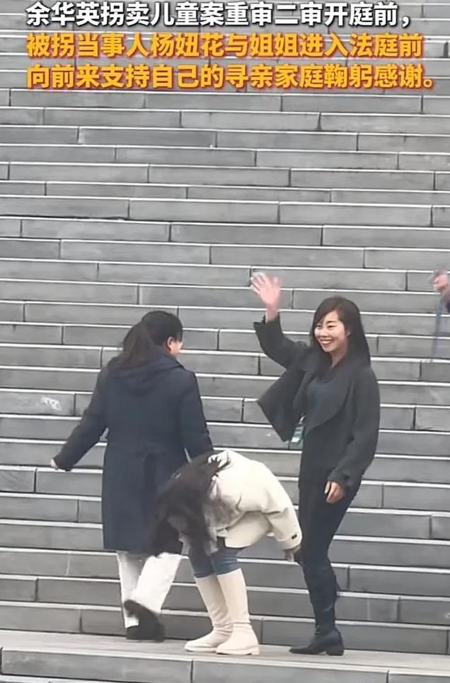 现场很多记者和被余华英拐卖儿童的亲人都来为杨妞花呐喊“加油”,听到群众为她加油的声音,杨妞花连忙鞠躬道谢。