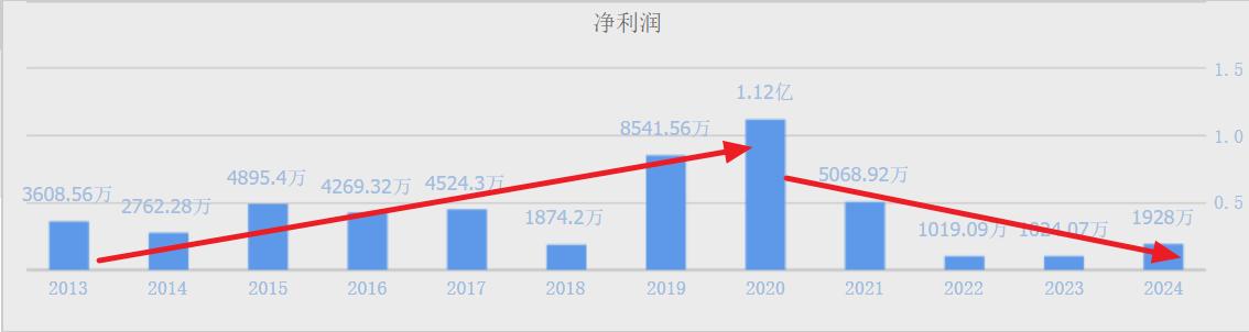 净利润更是从2021年的1.12亿骤降至2024年预估的约1019万,同比峰值跌幅高达246%。