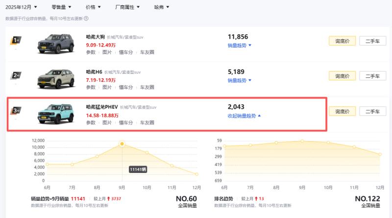 前不久出炉的2025年乘用车零售数据显示,2025年12月,哈弗猛龙PHEV的单月销量已经跌落到2043辆、创下了该车在2025年的最低点,较上一月11月4598辆,直接腰斩过半。而还需要注意的是,该车在11月的销量,已经是较去年10月份的8536辆的表现,腰斩近半的结果。