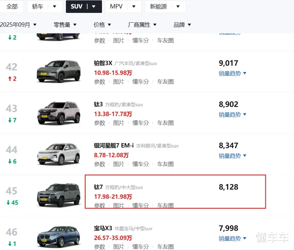 当然,除了海外市场和出口爆红,比亚迪公司今年最大的惊喜还是方程豹子品牌,特别是10月初上市的方程豹钛7方盒子越野车,该车以17.98万元的超低起步价,一步到位,直接给到了超低的门槛,同时借助免除购置税的最后时间窗口,更有逐渐消失的国补和省补。再加上钛7的高颜值,以及0续航焦虑,超高性价比彻底在年轻人群体之中一炮而红!因此,方程豹钛7彻底一飞冲天,10月份的具体销量还没公布,但9月份在产能未能充盈的前提下,依旧狂卖8128台,预计10月份该车的销量已经突破2万,妥妥的神车!