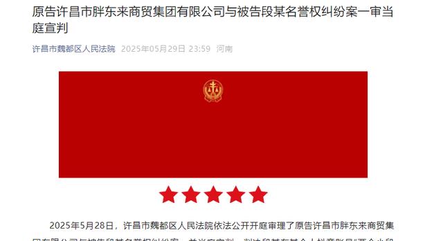 公众号 许昌魏都区人民法院 2025-05-29《原告许昌市胖东来商贸集团有限公司与被告段某名誉权纠纷案一审当庭宣判》