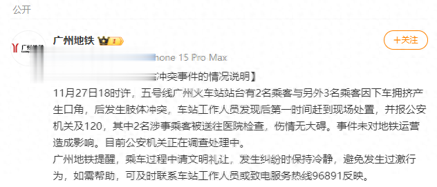 11月27日18时许,五号线广州火车站站台有2名乘客与另外3名乘客因下车拥挤产生口角,后发生肢体冲突,车站工作人员发现后第一时间赶到现场处置,并报公安机关及120,其中2名涉事乘客被送往医院检查,伤情无大碍。事件未对地铁运营造成影响。目前公安机关正在调查处理中。