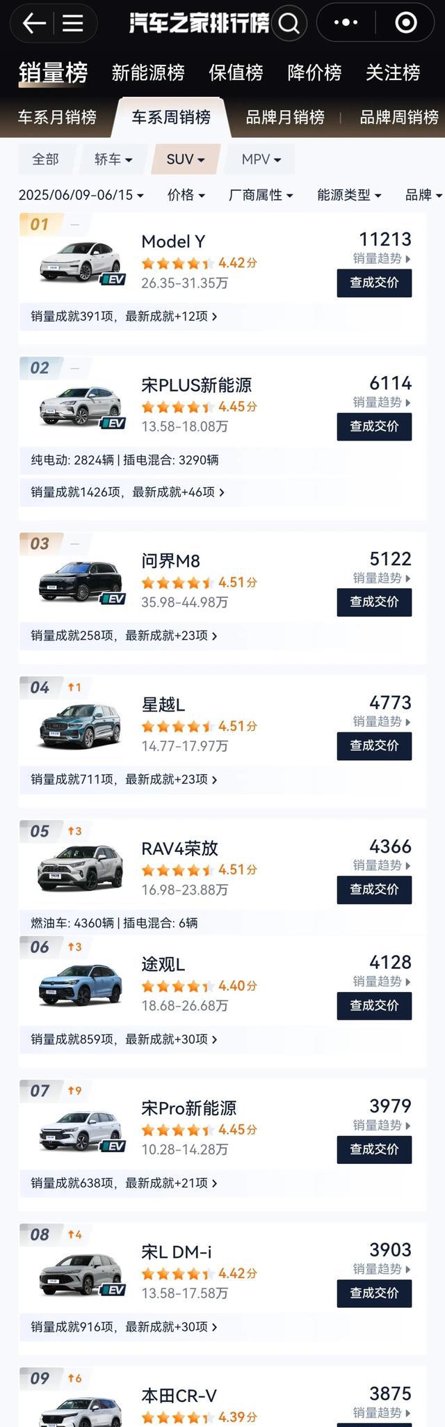 最近的数据显示,在第24周的市场中,SUV销量再次迎来大幅增长,超过60%的主流车型涨幅突破了20%。这组数据不仅让人振奋,也为我们带来了诸多思考。特斯拉的Model Y以惊人的销量11463辆,创造了五周连冠的辉煌成绩,几乎是与其竞争对手比亚迪宋Plus新能源销售量的两倍。这样的表现,能否维持?又将对未来SUV市场的格局产生什么样的影响?