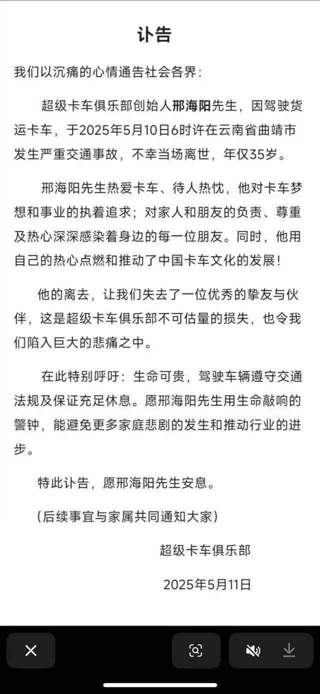 5月10日凌晨6点的云南曲靖,一声巨响撕裂了山间薄雾——那辆被卡友们称为“公路霸王”的红色斯堪尼亚V8重型卡车,如同折翼的钢铁巨兽侧翻在路基旁,驾驶室扭曲成废铁。车内,35岁的邢海阳再也没有机会向他的1.6万粉丝更新那条未完成的“川藏线穿越日记”。