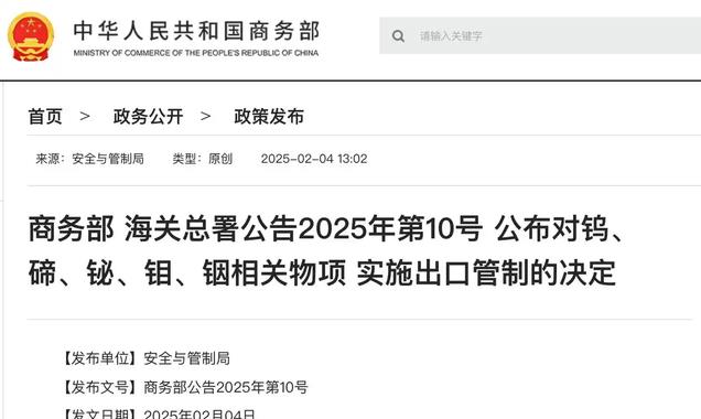 其次是出口管制。这次中国对钨、碲、铋、钼、铌相关物项实施出口管制。