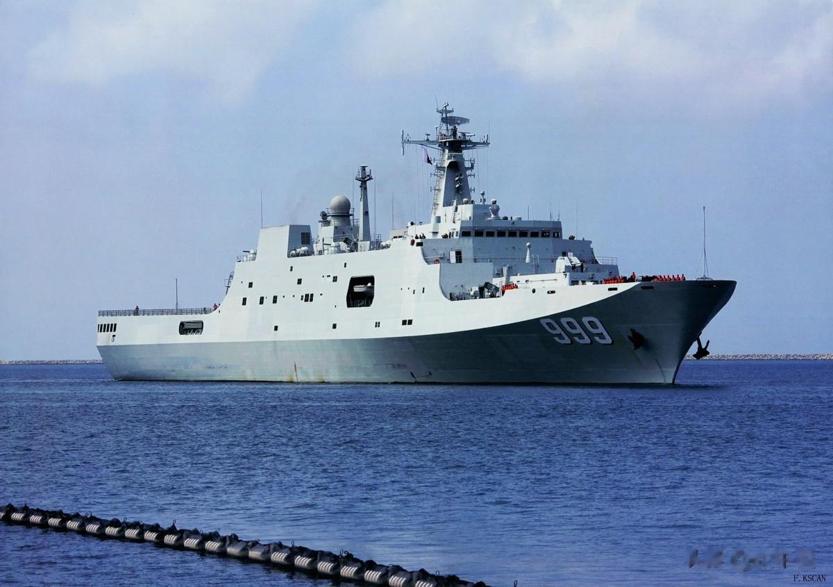 2、被称为“海上移动堡垒”的井冈山舰(舷号999),是071型综合登陆舰的代表。这艘满载排水量2.5万吨的巨舰,坞舱可容纳4艘726A气垫登陆艇,甲板能起降2-3架直-8直升机,单次可投送一个加强营的兵力与装备。