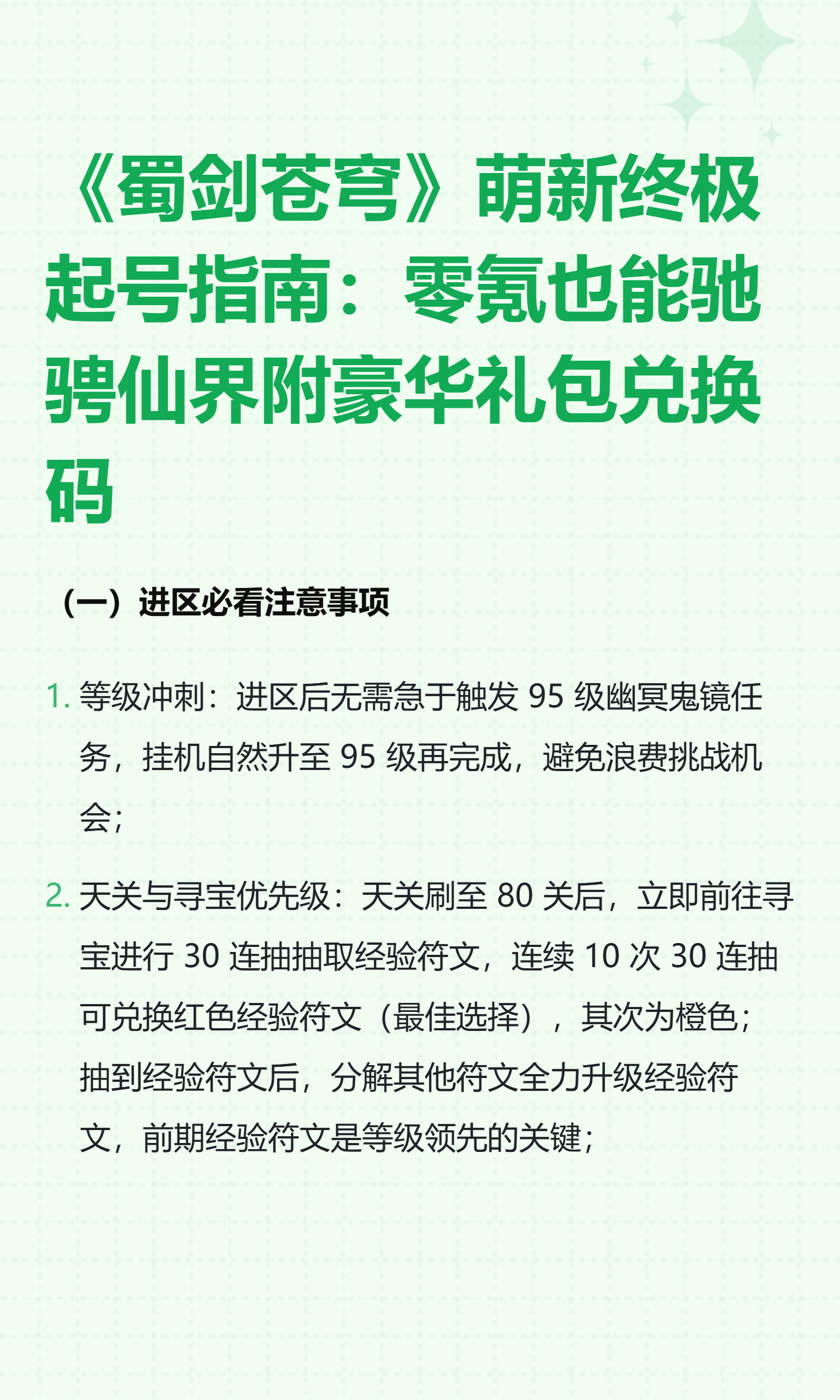 蜀剑苍穹进区后无需急于触发95级幽冥鬼镜任务,挂机自然升至95级再完成,避免浪费挑战机