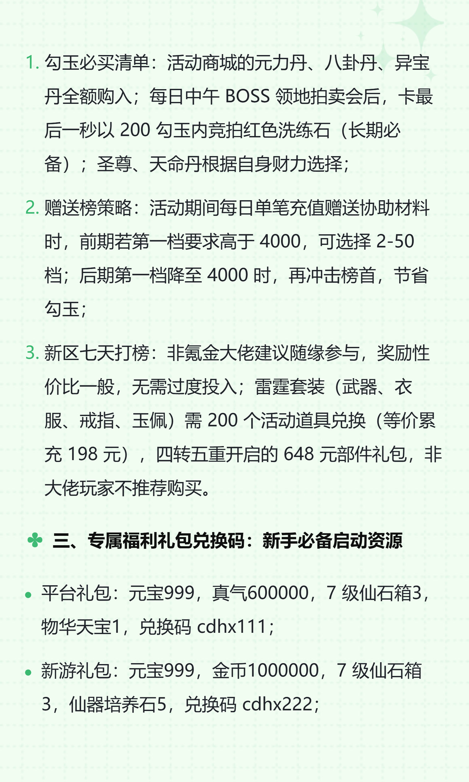 新区七天打榜:非氪金大佬建议随缘参与,奖励性价比一般,无需过度投入;雷霆套装(武器、衣服、戒指、玉佩)需200个活动道具兑换(等价累充198元),四转五重开启的648元部件礼包,非大佬玩家不推荐购买。