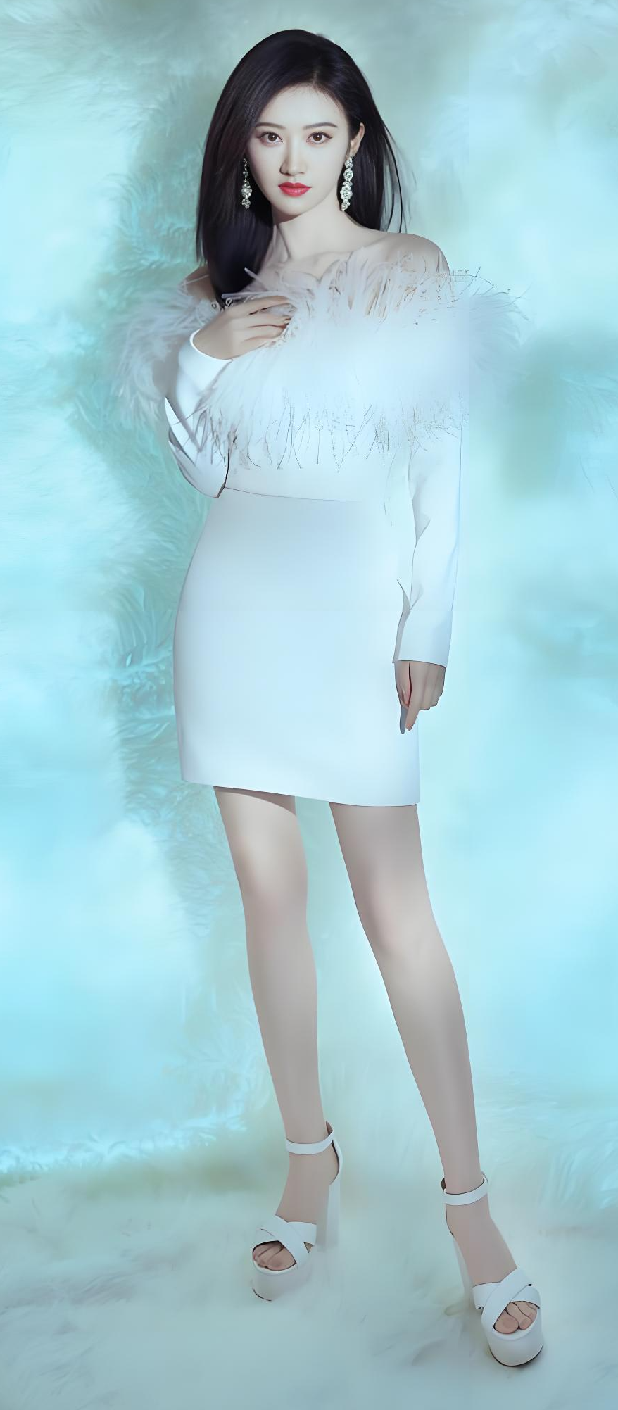 景甜的胸线是打破审美偏见的武器。在某活动中,她大胆挑战死亡芭比粉抹胸裙,通过立体剪裁将视觉焦点锁定在锁骨与脖颈,成功化解颜色带来的艳俗感。这种“性感减法”在高定礼服中更显精妙:2025年珠宝晚宴上,月白色刺绣礼服的深V设计被改良为斜向低开,既保留性感基因,又通过珍珠流苏转移注意力,被时尚评论家称为“东方欲拒还迎的高级表达”。