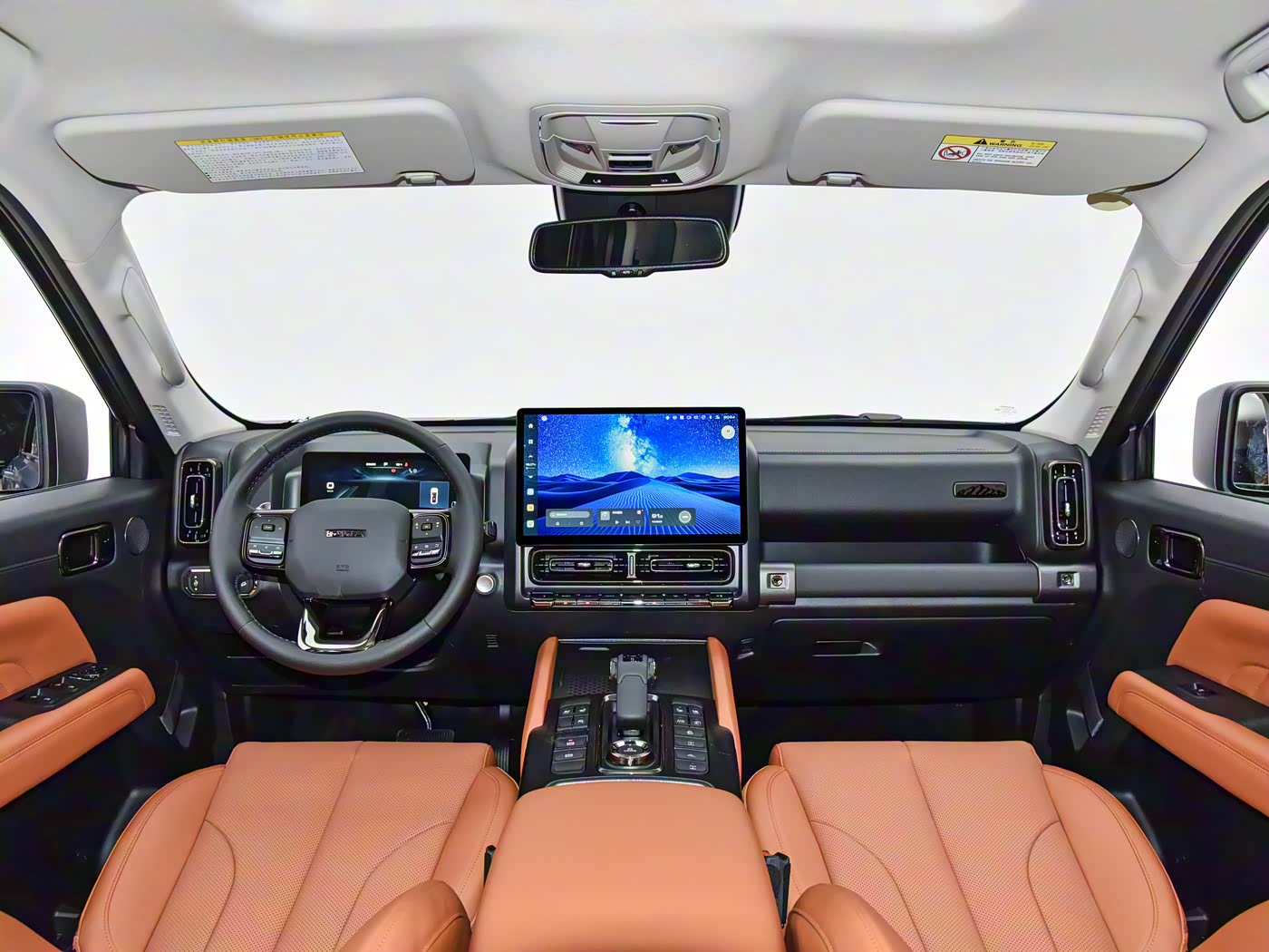 进入车内,座舱内部采用熔岩红双拼配色,中控台及门板等部位大量使用软质材料包覆,搭配精致缝线工艺,营造出越级的豪华质感。三辐式多功能方向盘搭配 14.6 英寸悬浮式中控屏与全液晶仪表,科技感十足,同时保留了中控台核心功能的实体旋钮与按键,确保越野时操作便捷。空间表现方面,2850mm 轴距带来宽敞的驾乘空间,五座版后备厢常规容积 791L,后排座椅纯平放倒后可扩展至 1814L,配合 45 处储物空间,露营装备、家庭物品均可从容收纳。座椅采用亲肤耐磨材质,靠背 9 层 + 坐垫 8 层的设计提供极强支撑性,部分车型还配备加热、通风及按摩功能。
