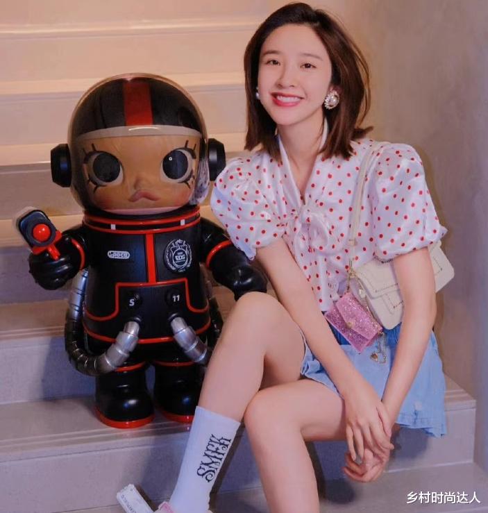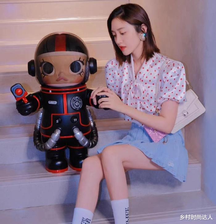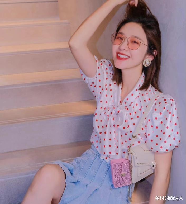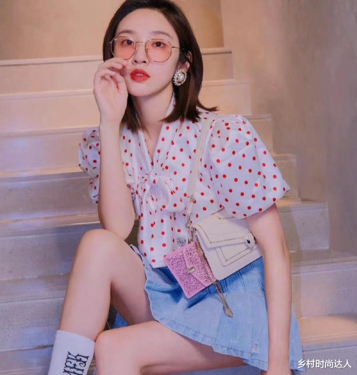 斑点上衣在这套造型中也是功不可没。仔细观察,斑点的大小错落有致,大斑点犹如夜空中闪烁的星星,醒目而独特;小斑点则像散落的珍珠,细腻又精致。它们不规则地分布在衣服上,为整件上衣增添了灵动的气息。这种独特的设计与蓝色牛仔短裙搭配起来,可以说是一种独有的服装搭配,不仅有萝莉的气息,同样又有少女的清纯!斑点的活泼与牛仔的质朴相互交融,碰撞出奇妙的时尚火花,让整个造型的时尚感直线上升。
