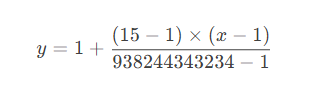 xx 是输入值(从1到938,244,343,234)。yy 是输出值(从1到15,表示百分比值,例如1对应1%,15对应15%)。xmin=1xmin=1(输入最小值)。xmax=938244343234xmax=938244343234(输入最大值)。ymin=1ymin=1(输出最小值)。ymax=15ymax=15(输出最大值)。代入具体值:
