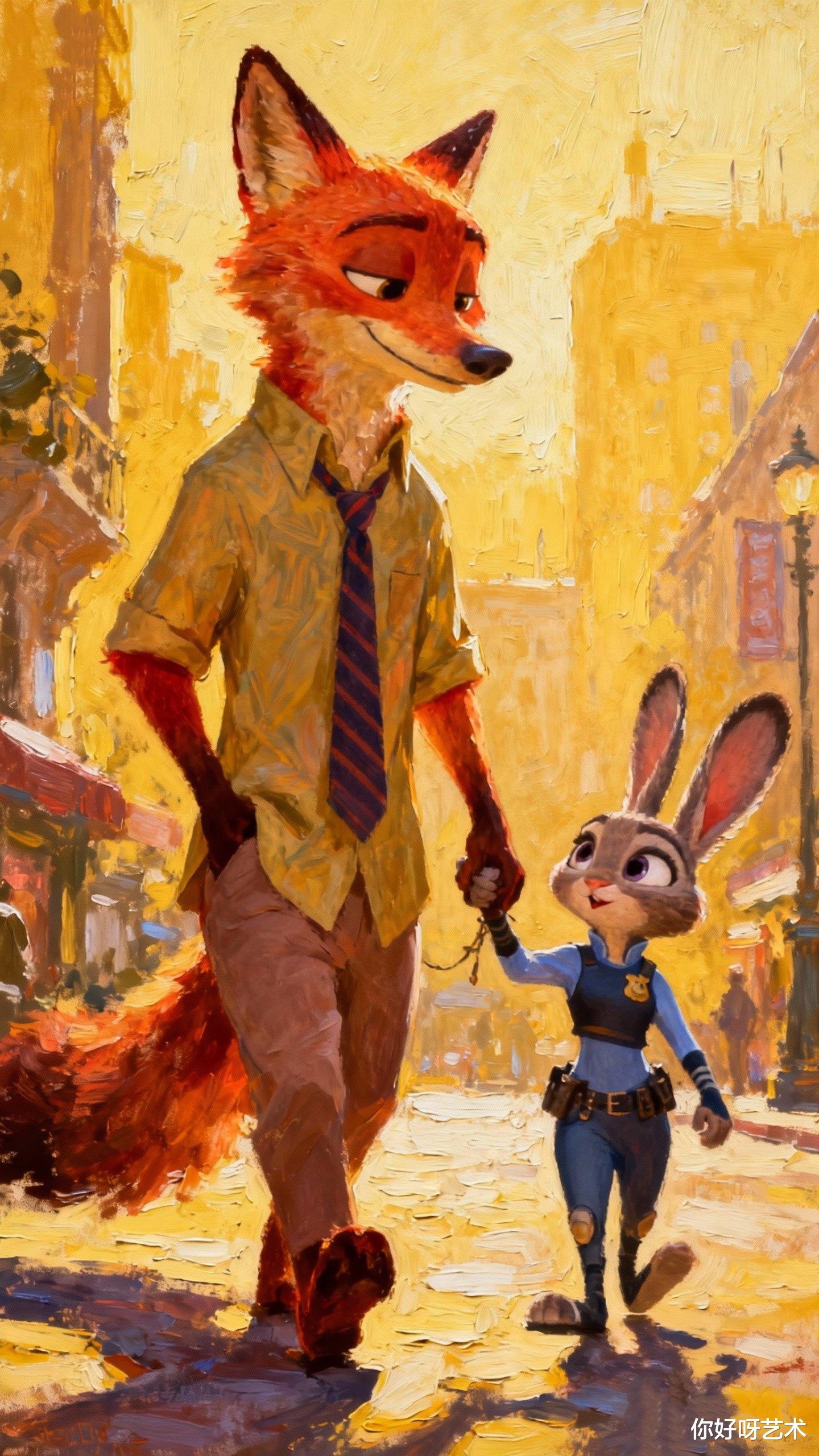 最后一笔,我给他的眼睛点了点琥珀色。不是最初那副漫不经心的冷光,是掺了点暖橙的琥珀色,瞳孔中央用纯白点了颗细碎的星——那是他帮朱迪在雨林区找线索时,眼里闪的光;是他看着朱迪为说错话而自责时,眼里藏的心疼;是他最后穿上警服,对着朱迪笑时,眼里盛的温柔。我蹲在画布前,看着那双眼在油彩里慢慢“亮”起来,忽然想起他说过的话:“我曾经以为,不抱期待就不会失望,直到有人告诉我,有些事值得你赌上一把。”