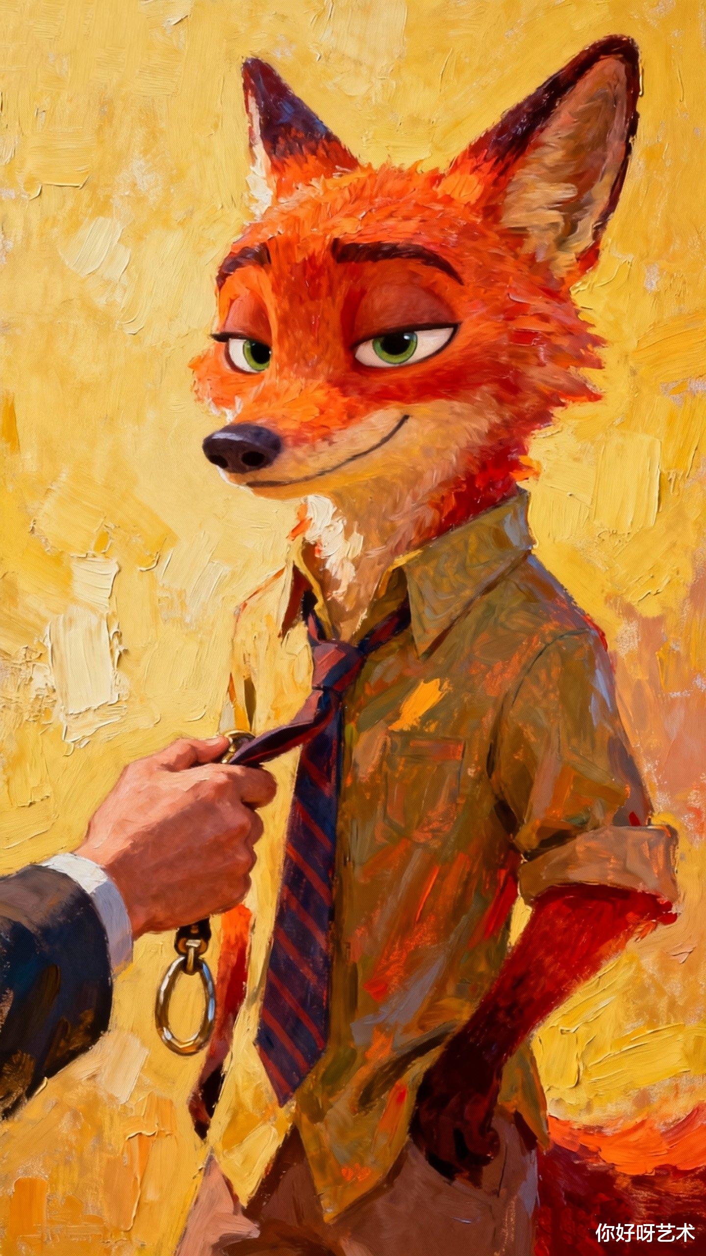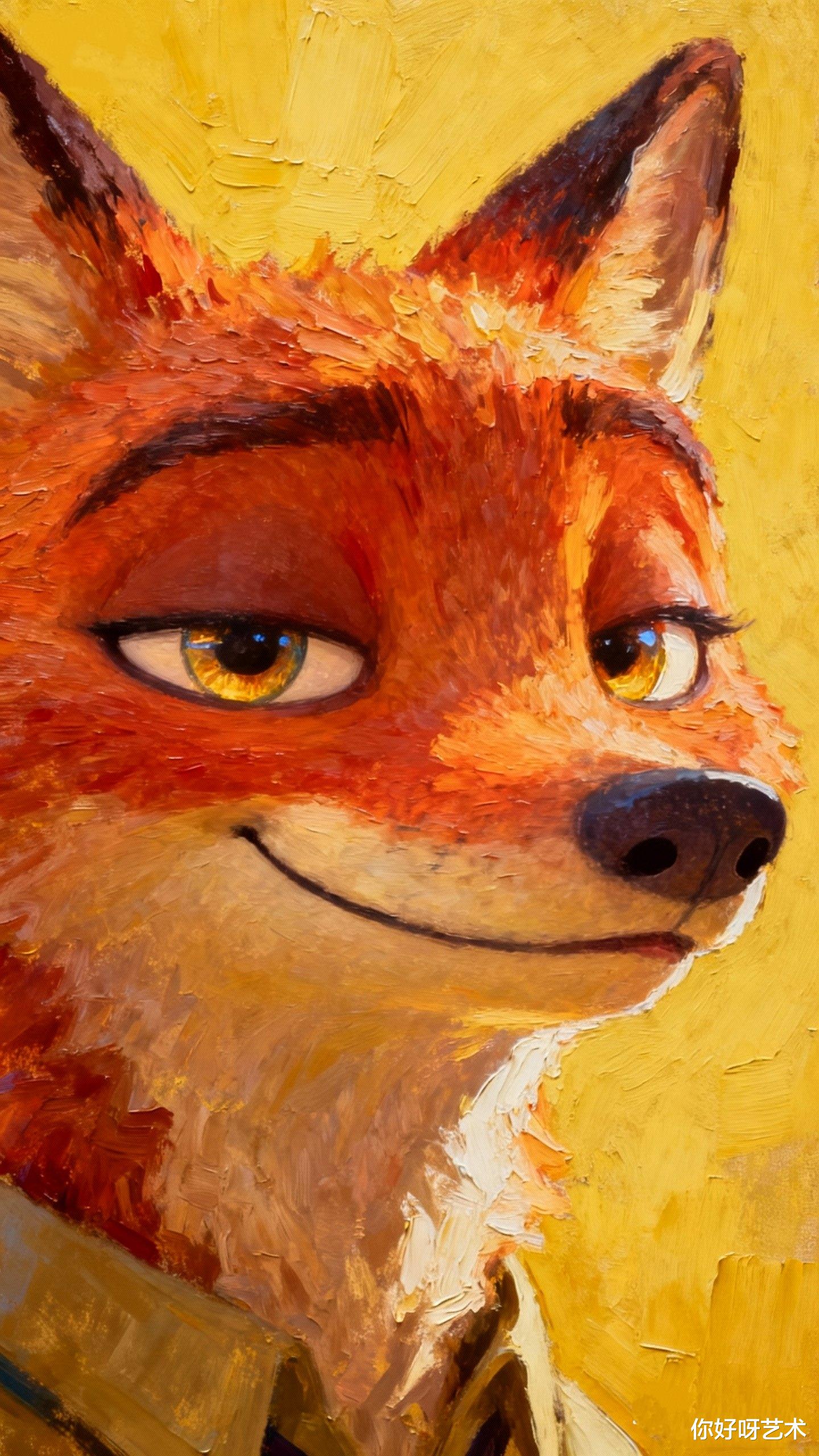 画布中央的轮廓在油彩里慢慢清晰。我画的不是他后来穿警服的模样,是初遇朱迪时的姿态:驼色的围巾松松绕在颈间,边角处用干笔蹭出磨损的痕迹,像他戴了多年、早已洗得发软的旧物;手里捏着半根未化的 popsicle,透明的糖霜用钛白与浅蓝细细提亮,却在指尖处添了点深褐的阴影——那是他给小北极狐“找工作”时,攥着伪造证件的力道,也是他习惯用漫不经心掩盖真心的小动作。他的耳朵微微耷拉着,耳尖那点黑没画得过于锐利,反而带了点柔和的弧度,像他嘴上说着“小警官别多管闲事”,却在朱迪蹲在雨里捡罚单时,悄悄放慢了离开的脚步。