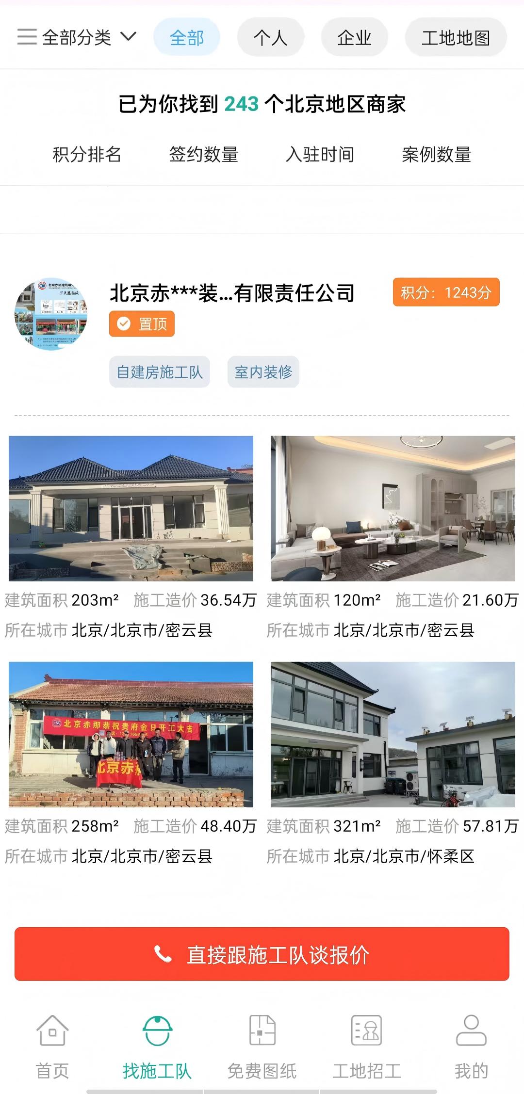 内置“工地地图”功能,用户可查看全国正在施工或已完工项目的具体位置、施工介绍及实景图片,通过施工前后对比,直观评估施工方的专业水平与工艺细节。