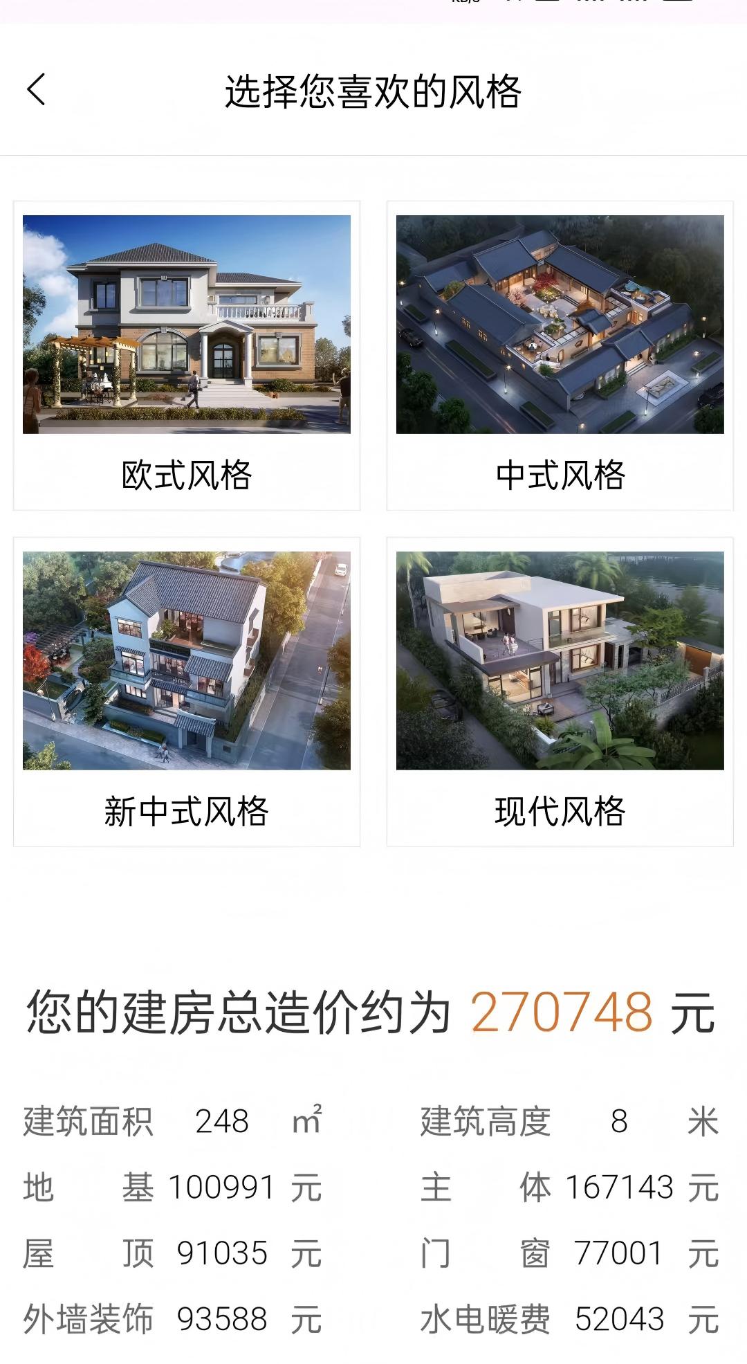 根据所选户型、面积、材料档次等参数,系统可初步估算建房总成本