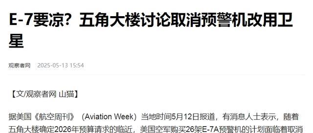 1、观察者网《E-7要凉?五角大楼讨论取消预警机改用卫星》