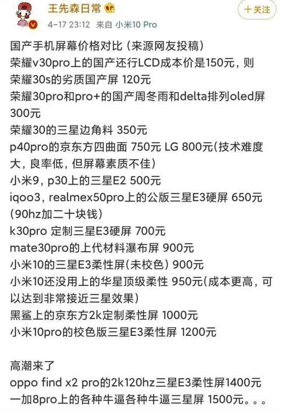 此微博主自三星败退国内市场后,归属于哪家手机公司宣传部咱就不去深究了,相信经常混迹手机数码圈的都心知肚明。观看此人微博,那真的是一言难尽,毫无底线可言,为抹黑华为可谓是无所不用其极,和评论者对骂能力罗老师可能都要逊色半筹,言语间充斥着对华为的偏见及蔑视。至于他发表的标题为国产手机屏幕价格对比的这些数据完全就是扯淡,可能他自己也知道是扯淡,于是后面括弧了相当于免责声明一般的文字:来源网友投稿。若是真如此人造谣所说,以华为和荣耀的市场占有率,按清单所列屏幕价格有多少要多少加点再转手批给手机维修店岂不是能瞬间实现王健林的一个小目标?