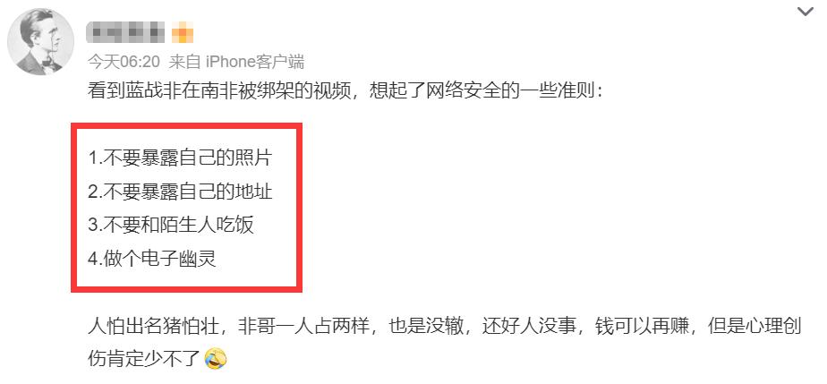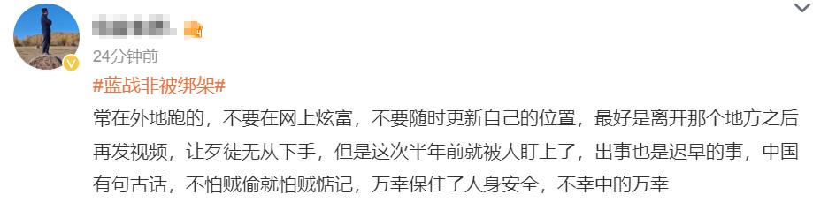 另外,身为大网红,蓝战非每到一个地方都会发动态,从而曝光了自己的IP地址,安全意识太单薄,还有很多动态中,蓝战非都展露出不俗的财力,这也让坏人动了歪心思。