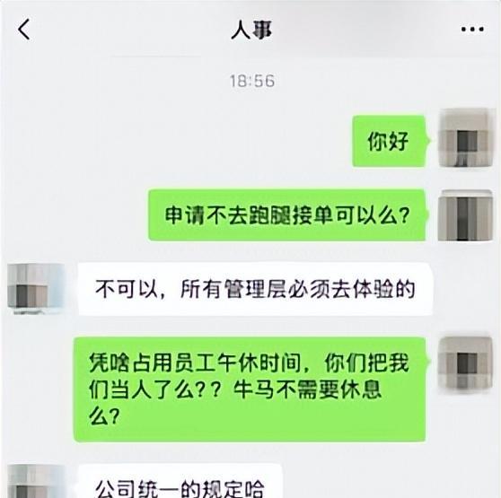 在这名管理层的聊天记录中可以看到,他先是问人事,能不能申请不去跑腿接单。