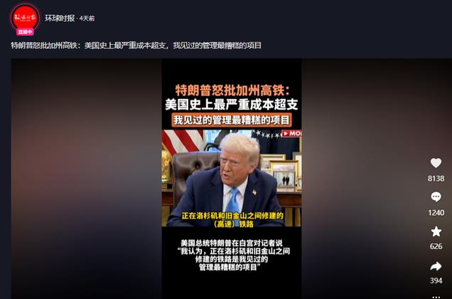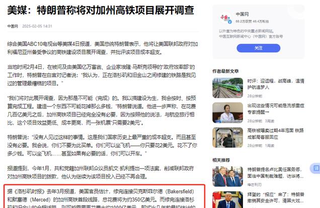 信息来源:中国网2025-02-05美媒:特朗普称将对加州高铁项目展开调查